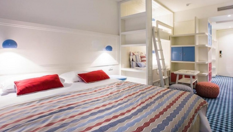 Družinska soba 2+2 BALKON: dvoposteljna soba + pograd za 2 otroka do 12 let (ležišče 80 x 180 cm), z balkonom, tuš, klima, Sat TV; velikost sobe: cca. 28 m2 (spalnica 23,5 m2 ter balkon 4,5 m2).