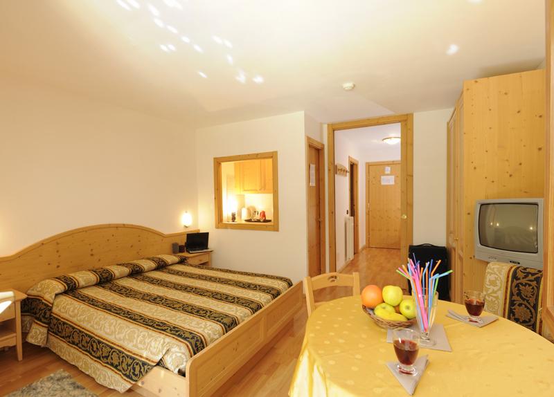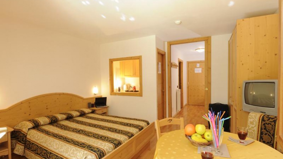1/3 enosobni apartma: dnevni prostor s kuhinjsko nišo, zakonsko posteljo in 1 ležiščem v predprostoru, ki je ločen od dnevnega prostora z drsnimi vrati.