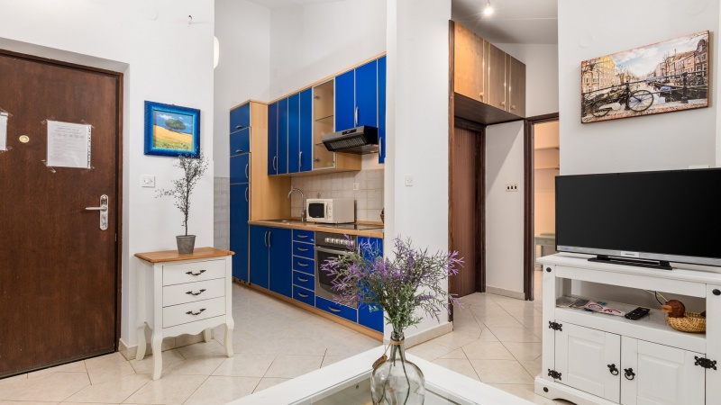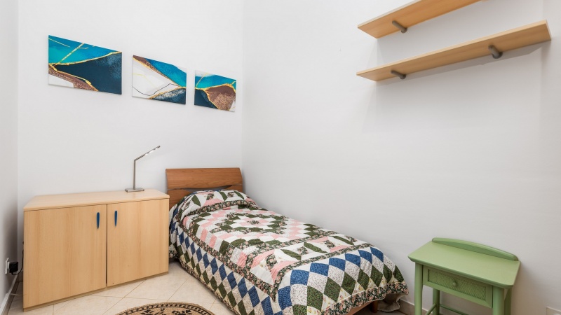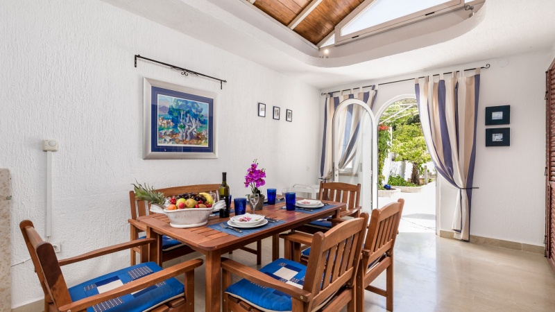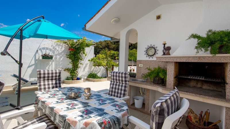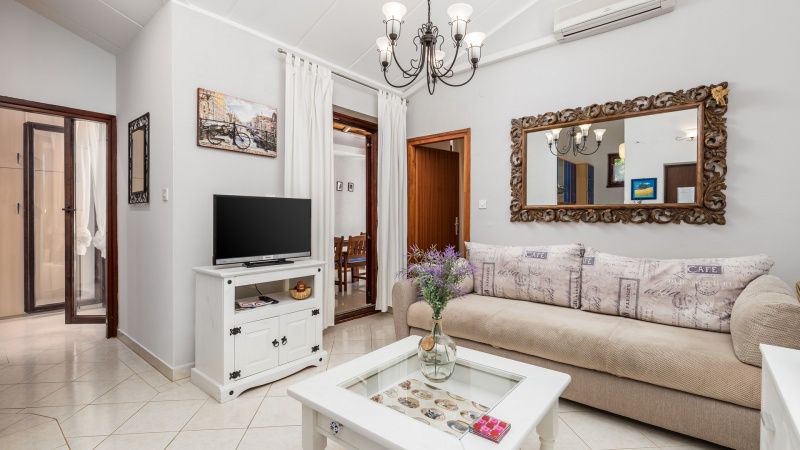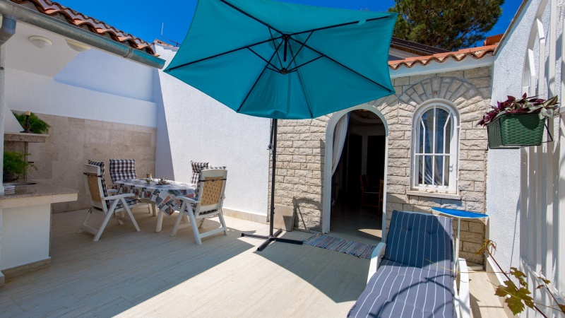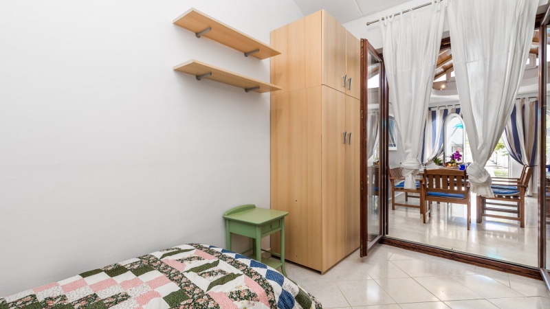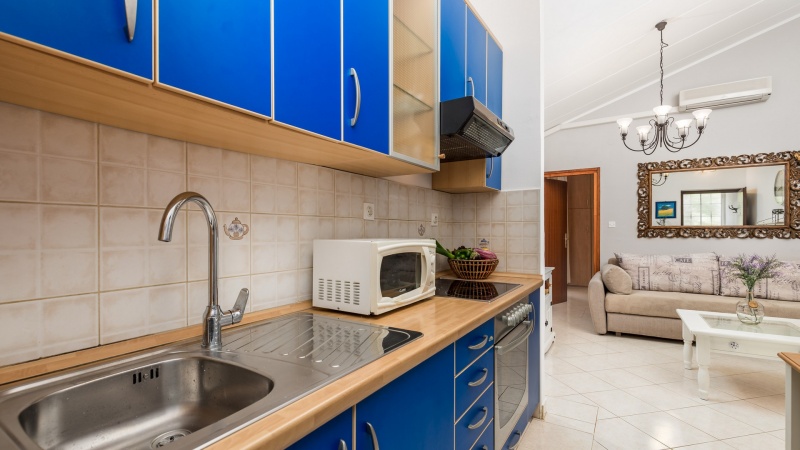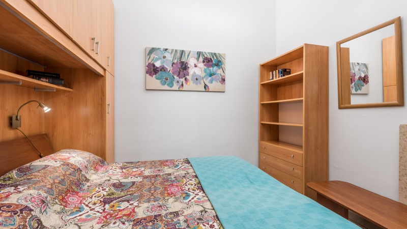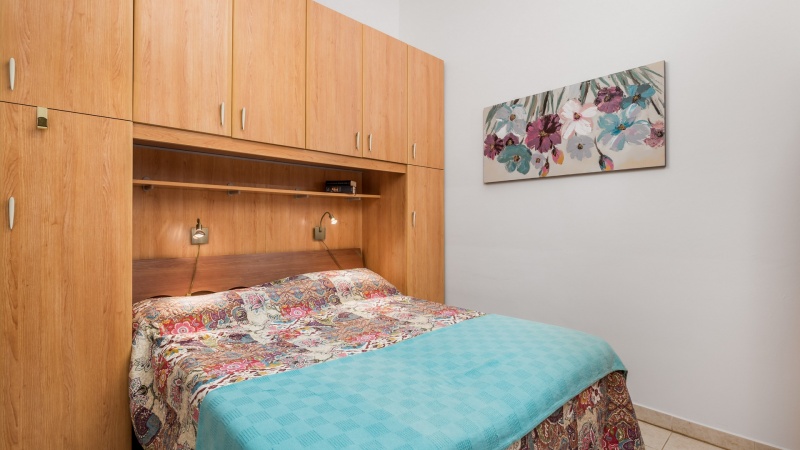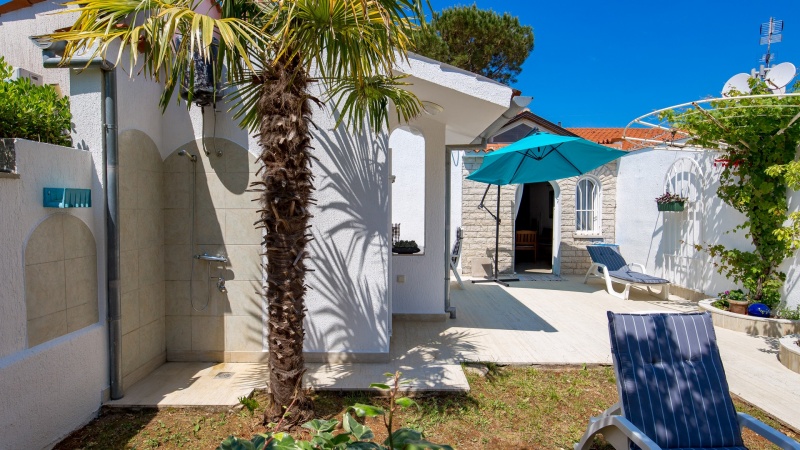 Namestitev: (60 m2): dnevni prostor s kuhinjsko nišo in raztegljivim kavčem za eno osebo, spalnica z zakonskim ležiščem, spalnica z enojnim ležiščem, tuš/WC, klima, SAT TV, pečica, pralni stroj, zunanji tuš, vrt, parkirišče v bližini (doplačilo). 350m od trgovine, 540m od morja.