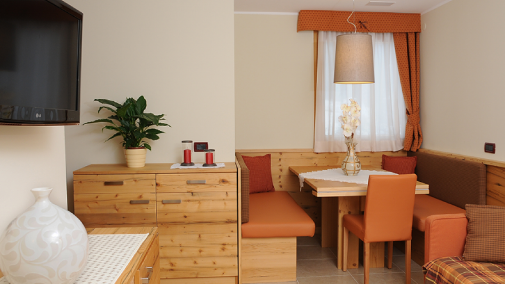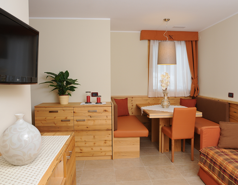 1/4 dvosobni apartma (cca. 42 m2): soba z zakonsko posteljo, ter dnevni prostor s kuhinjsko nišo, jedilnim kotom ter raztegljivo zakonsko posteljo, TWC.