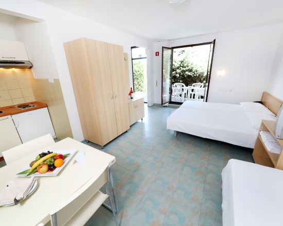 - 1/3 STUDIO klima: studio za največ 3 odrasle osebe, 28 m²; dnevno-spalni prostor s tremi ležišči in dodatnim ležiščem, klimatska naprava, kuhinjska niša, kopalnica s prho, sušilnik za lase, sat. TV, telefon, terasa ali balkon