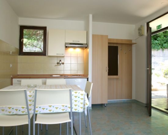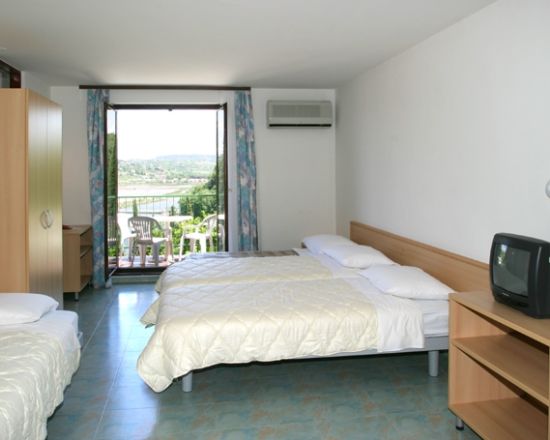 - 1/5+1 APP klima: apartma za največ 5 odraslih in 1 otroka, 42 m²; dnevno-spalni prostor s tremi ležišči in dodatnim ležiščem, dvoposteljna soba, klimatska naprava, kuhinjska niša, kopalnica s prho, sušilnik za lase, sat. TV, telefon, terasa ali balkon