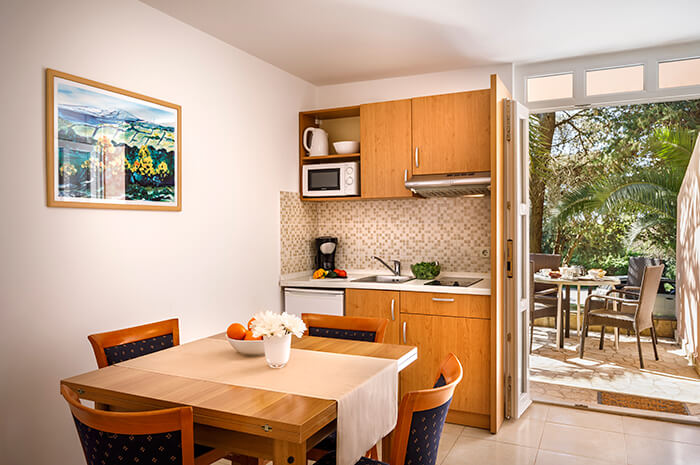 1/2+2 app – samostojna hišica, dvoposteljna soba, dnevni prostor z raztegljivim kavčem, kuhinjska niša, mikrovalovna pečica, tuš/WC, fen, terasa.