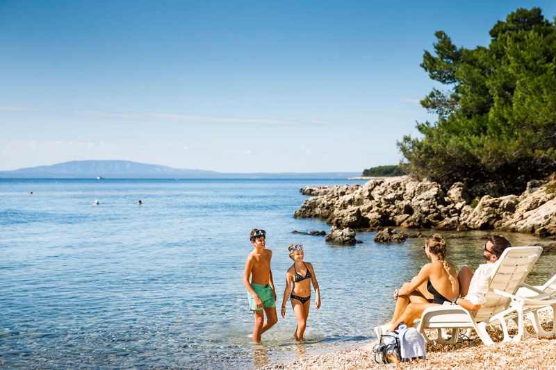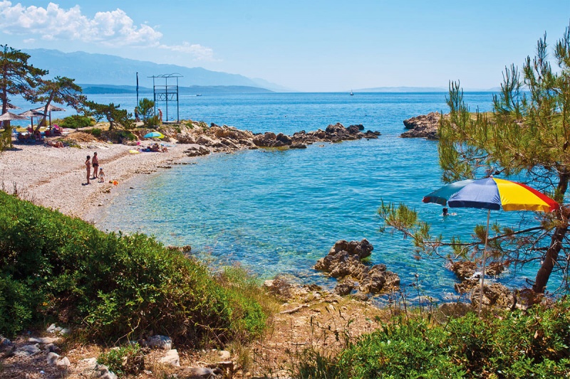 Plaža: kamnita in delno betonirana, tudi peščeni zalivi, oddaljena cca 300m. Nudistična plaža v bližini.