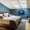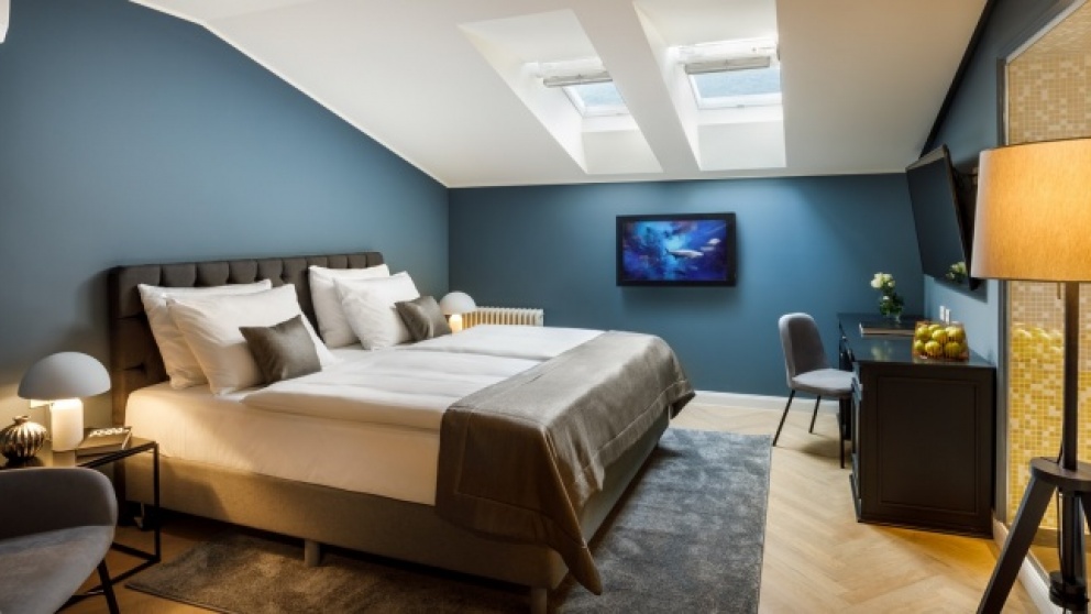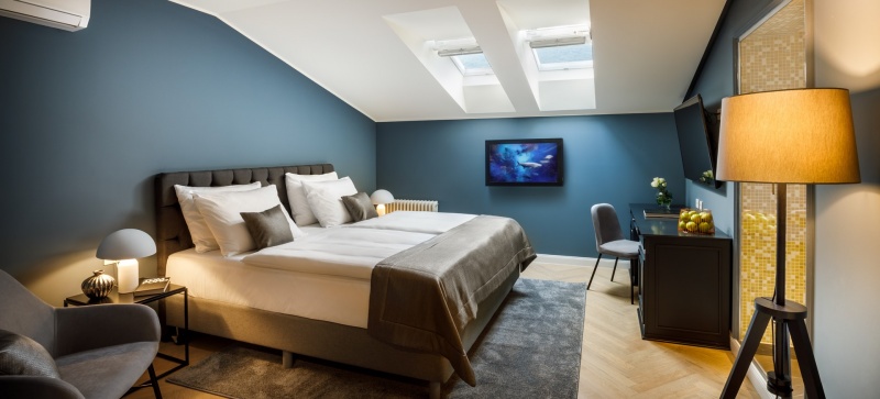 - 1/2 COMFORT MANSARDA: Dvoposteljna soba Comfort se nahaja v mansardi. Velika je 24-28 m2. Zakonska postelja 200x210. Kopalnica s tušem. TV, fen, minibar.