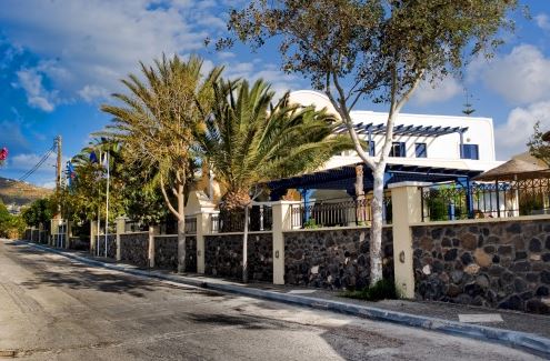 Lega: Hotel, sestavljen iz dveh stavb se nahaja v središču vasice Kamari, le 200 m od istoimenske čudovite črne peščene plaže. Od samega središča Kamarija, kjer je obilica možnosti za nakupovanje v trgovinah, okrepčilo v tavernah in restavracijah ali posedanje v lokalih in barih, je oddaljen le 300 m, od glavne sprehajalno-nakupovalne ulice, ki se razteza ob plaži, le 150 m in od glavnega mesta Fira le 7 km.