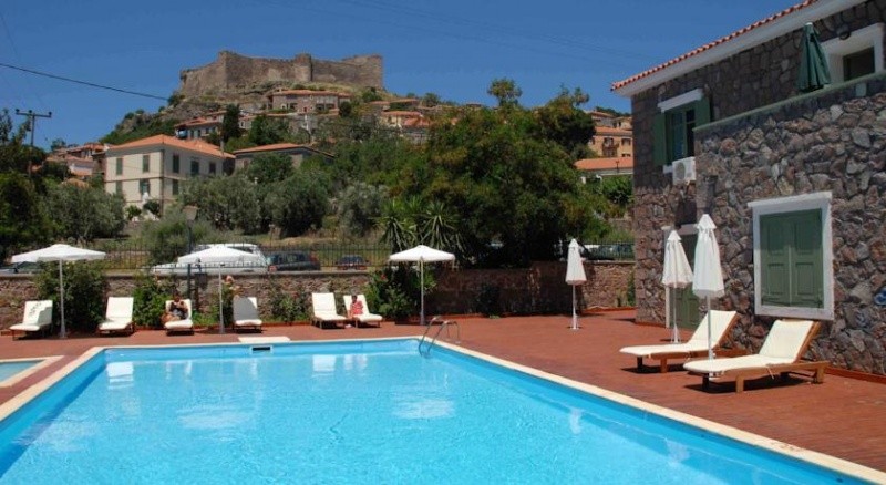 Lega: Nekoč stiskalnico oljk, na katero še spominja dimnik sredi dvorišča, so v posebnem slogu preuredili v hotel in v enakem slogu dogradili še apartmajsko stavbo. Hotel je v Molyvosu neposredno ob mestni plaži, ki jo je Evropska unija nagradila z modro zastavo za kristalno čisto morje, le nekaj minut od središča s tavernami in lokali, 10 minut od slikovitega pristanišča in 50 m od hotela Molyvos I.