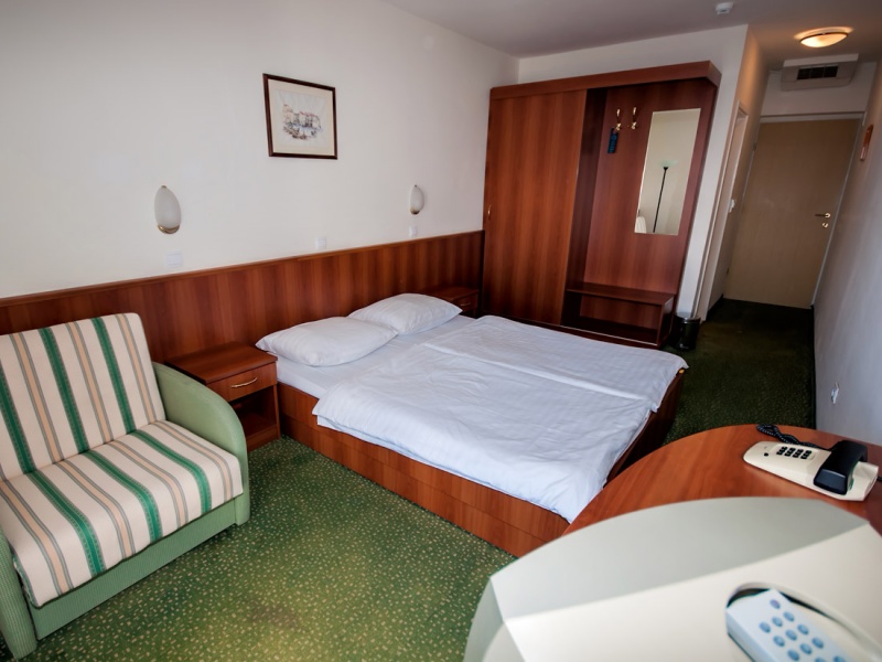1/2 B (pribl. 30 m2): zakonska postelja, kopalnica (prha, WC, sušilec za lase), klima, SAT TV, telefon, hladilnik, balkon na park stran.