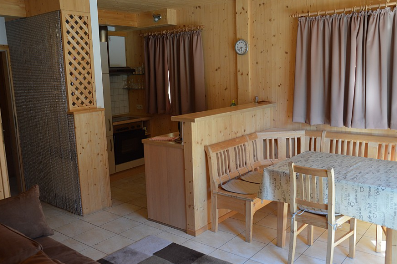 Soba z zakonsko posteljo, soba s pogradom, dnevni prostor s kuhinjo, jedilnim kotom in raztegljivim kavčem, TWC.