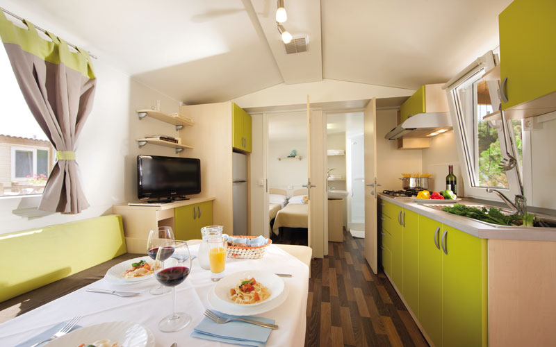 Mobilne hišice: kopalnica, prha, sušilnik za lase, kuhinjska niša, hladilnik, klimatska naprava (centralna regulacija), zaključno čiščenje, balkon ali terasa, TV, dvojna postelja, pečica, mikrovalovna pečica, aparat za čaj/kavo