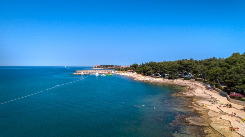 Kamp leži 1 km od starega mestnega jedra Novigrada tik ob morju. Obdajajo ga kamnite uvale, del plaže je obložen s ploščami, majhen del je prodnat. Na plaži boste našli prhe in kabine za preoblačenje ter razkošno senco starih borovcev.