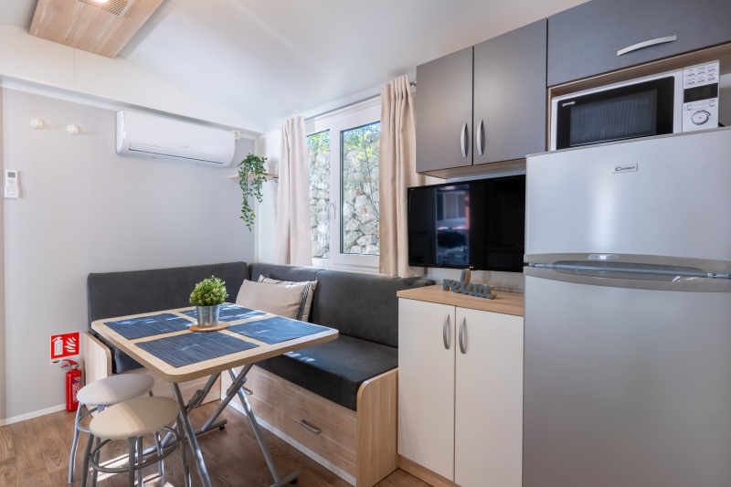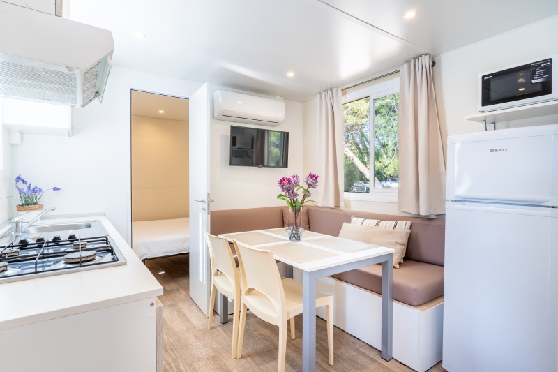 - MH 4-6 COMFORT: 24 m² za največ 4 odrasle osebe in 2 otroka do 12 let; dnevni prostor z možnostjo ležišča (za dva otroka), mizo in opremljeno kuhinjsko nišo, hladilnik, kuhalna plošča, mikrovalovna pečica, grelnik za vodo, sat. TV, klimatska naprava, spalnica z zakonskim ležiščem, spalnica z dvema ločenima ležiščema, kopalnica s prho, dodatno ločen wc, terasa z vrtno garnituro.