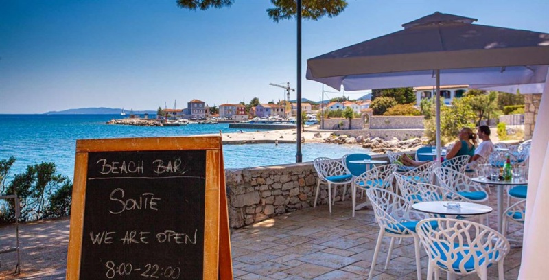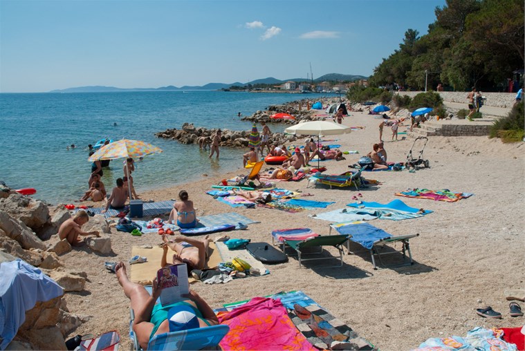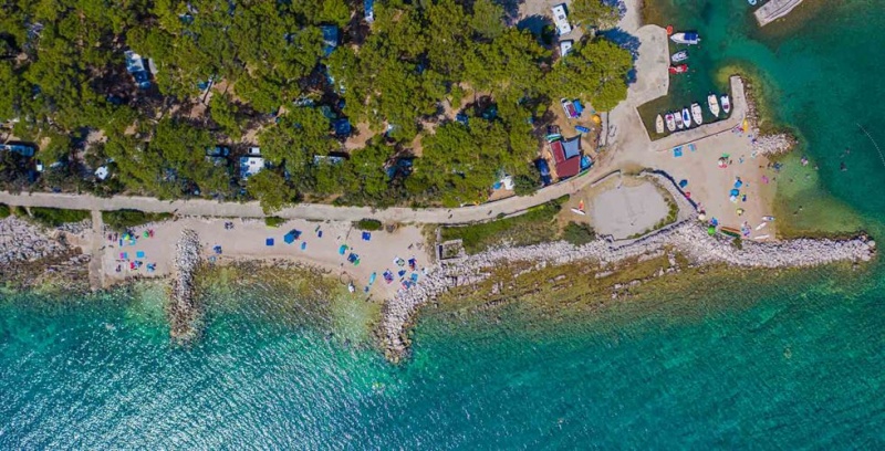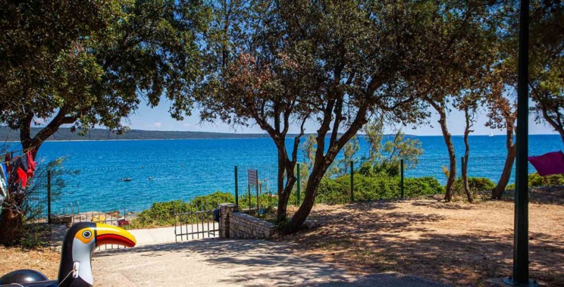 Plaža: Plaža je delno skalnata, delno prodnata, urejena betonirana mesta za sončenje; le 50 m oddaljena plaža za pse.
